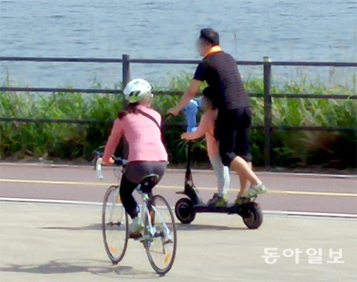 연휴 첫날이었던 5일 서울 광진구 뚝섬한강공원 자전거도로 바로 옆에서 어른과 아이가 헬멧, 보호대 등 안전장구를 갖추지 않고 전동킥보드를 타고 있다. 서형석 기자 skytree08@donga.com